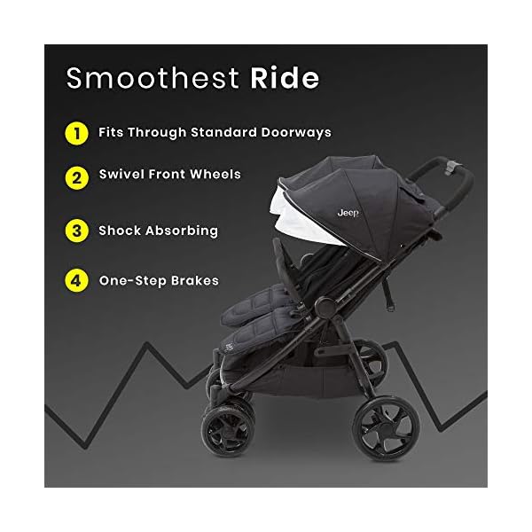 The J is for Jeep Brand Destination Ultralight Side x Side Double Stroller makes it easier than ever to go places, do things and see sights with your whole family. Loaded with features that make errands with multiple children a breeze, this double stroller offers independently reclining seats and foot rests to cater to each child’s needs and comfort. Two oversized canopies with extended able SPF 50 sun visors protect little ones from harsh rays, rain or snow while peek-a-boo windows allow you to keep an eye on your children as you walk. Large enough to be comfortable for two children, slim enough to fit through 30″ doorways with ease, and sturdy enough to be your go-to everyday stroller, the J is for Jeep Brand Destination Ultralight Side x Side Double Stroller grants you the freedom to make every trip an adventure. Easily adapt to varying terrain with the stroller’s front swivel-lock wheels, unlock for easy maneuverability on even surfaces, and then lock for added stability on bumpy surfaces. And when you’re done exploring, this double stroller with an easy, compact fold closes in seconds and stands upright. The stroller’s lightweight aluminum frame, foam handles and carrying strap make loading it in the car or taking it on vacation a stress-free task. Since 1941, the Jeep brand has been a symbol of freedom and expression. Influenced by a love of the great outdoors. J is for Jeep Brand products are created for life’s little adventurers.