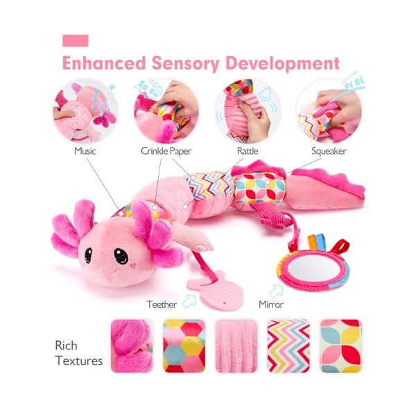 😊【Versatile Musical Soothing Axolotl】Our stuffed animal offers a plethora of sensory experiences including music, crinkly & squeaky sounds, mirror, rattle, and teether, making it perfect for car seats, cribs and strollers. Ideal for soothing babies during trips and diaper changes, providing a sense of security even during sleep.