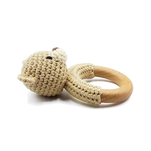Safari Animals Wooden Baby Rattle Toys Stuffed Crochet Rattle with Teether Ring for Newborn, Beige Bear