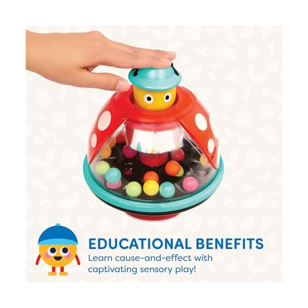 Ready, set, pop! This ladybug ball popper is a sensory sensation. Watch little ones light up with curiosity when they push the top down and send 20 brightly colored balls popping wildly about! Kids will love watching the cute ladybug face spring back up too. Inside, a shiny surface reflects all the action for even more excitement! This tumble toy is just the right size for little hands. While they have fun, toddlers will also learn about cause and effect and practice their fine motor skills. Like all Battat toys, the Ladybug Pushtop is made of safe and durable materials and meets or exceeds EU, U. S., and Canadian safety standards.