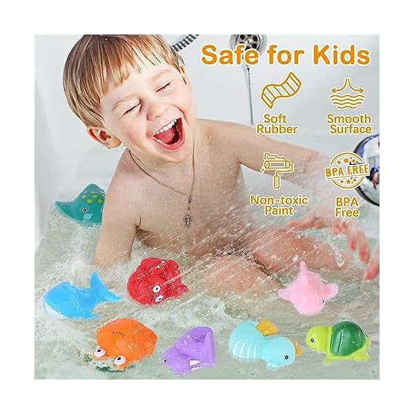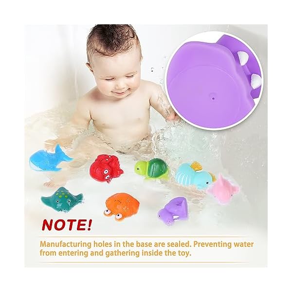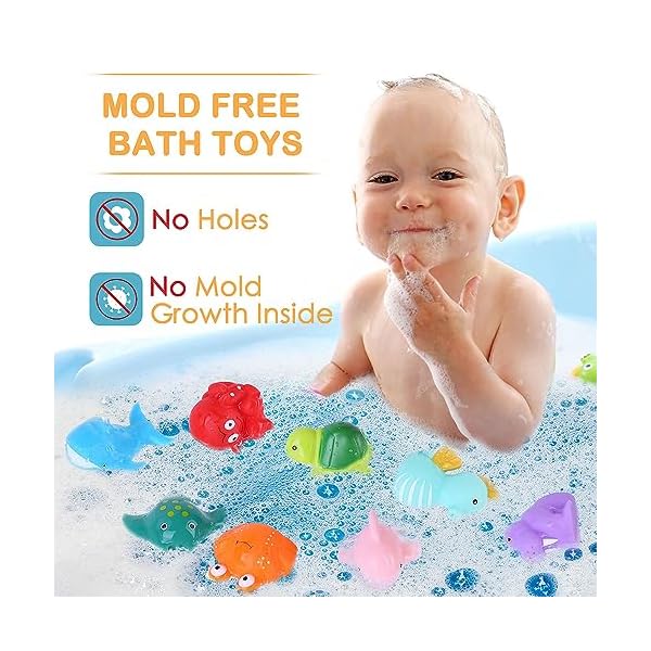 Mold-Free & Safe: Our baby bathtub toys have no holes, they are completely sealed with food-grade epoxy glue, ensuring that no water gets in and no mold grows; These baby and toddler toys are made of latex-free PVC, BPA-free, No phthalates; non-peel, non-toxic paint; Safe for toddlers