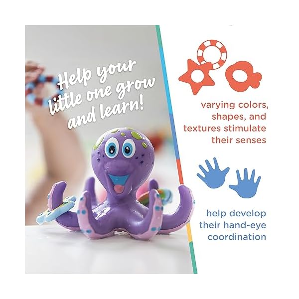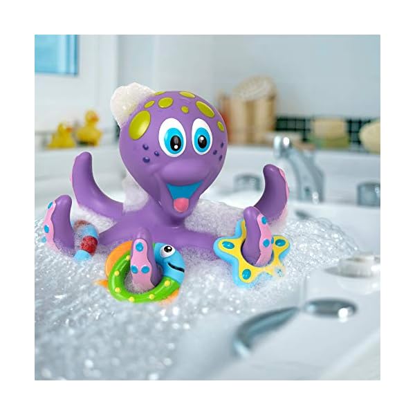 INTERACTIVE BATH TOY FOR KIDS 18+ MONTHS: This baby bathtub toy features a floating octopus and three rings to toss and stack that encourage learning through play and help children learn cause and effect