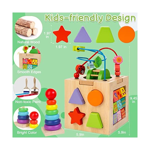 【Safe for Babies】The wooden activity cube toddler toys age 1-3 are made of high-quality natural wood, bright colors are non-toxic water based paint. Smooth edging around all sides of the cube and blocks, so no worries about baby getting a splinter. Perfect shape and size for little hands.
