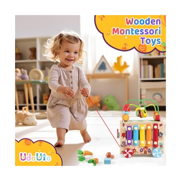 【 Multifunctional Activity Cube Cart 】 9-in-1 Wooden Montessori toy: bead maze, baby xylophone, learning clock, spinning gears, carrot harvest, mushroom picking, worm catching, shape sorter, push and pull cart, animal cards and dinosaur bubble stickers. Kids will flip from one game to the next and the versatile activity cubes will keep their attention for hours.