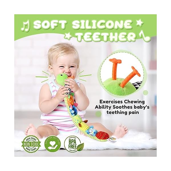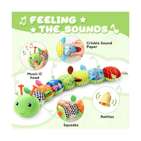 Musical Toys for Newborns – This baby toy is carefully designed for newborn babies after extensive research. The caterpillar’s head has a built-in music IC box, just press the caterpillar’s head and the music will play. The music could lasts about 22 seconds and is of the lovely lullaby type. You can use it to soothe your newborn baby.
