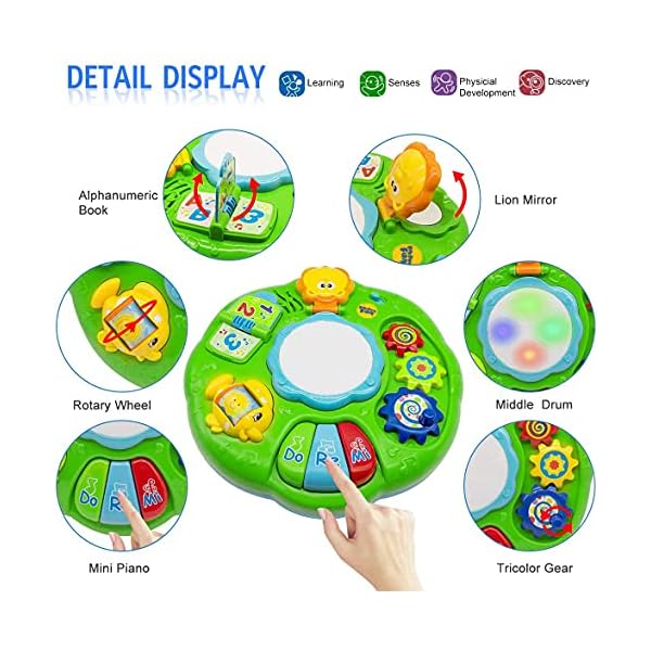 【MULTI-FUCTION TABLE TOYS】 The middle drums can flash beautiful lights and play classic melodies; Flip the page, you can see Numbers & Letters, accompanied by wonderful music; Opening the cartoon lion mirror lets your baby start to know himself; Rotate the fish wheel to show two kinds of scenes, playing night and day sound; Rotate the colorful gear with the hand,3 gears will rotate together, and play different wonderful music, Mini piano DO,RE,MI, which is a simple music experience start.