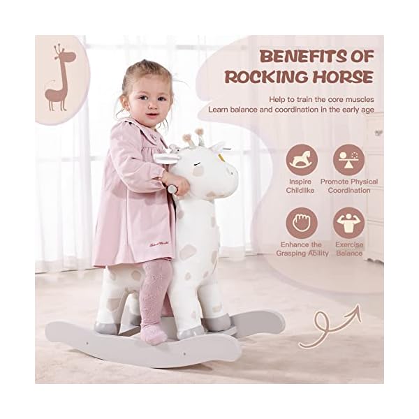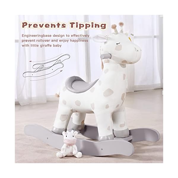 ☾Great Design for 12M+ Baby☽ ✿Cute pocket giraffe doll can easily attracts baby’s curiosity.✿Rattles paper in Giraffes’ ears that rustling to attract kids’ attention.✿Wear-resistant & soft leather seat cushion, with anti-tipping buffer bump rear.✿Anti-rolling sway bar-arc curve, keep swing arc within a safe range and protect your floor. All details make this Kids Ride-Ons a favorite Wooden Rocking giraffe gift for toddlers☺.
