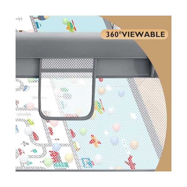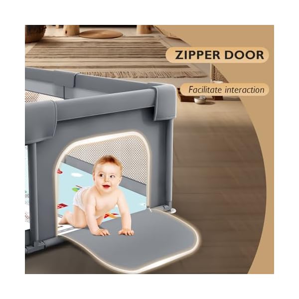 UNIQUE DESIGN: The side of the baby playpen comes with a zipper door, which makes it easy for your baby to get in and out while still being able to interact with mom in a fun way, in addition, we have added external attached pockets, you can put your baby’s diapers, toys, and other items inside for easy access. The baby playpen has 360° visibility, when mom is busy with her things, baby can see mom through the playpen so baby is no longer afraid.