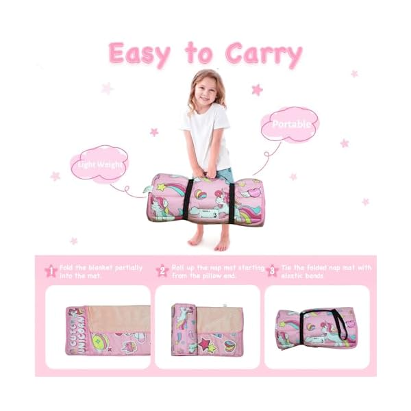 【Roll-Up Design】- The toddler daycare nap mat rolls up from the pillow end to the tail, secured with an elastic band. It also features a convenient carrying handle, making it easy for kids to carry. This mat with a built-in pillow is the ideal choice for daycare, and a perfect companion for children to nap during travel, camping, picnics, and other outdoor activities.