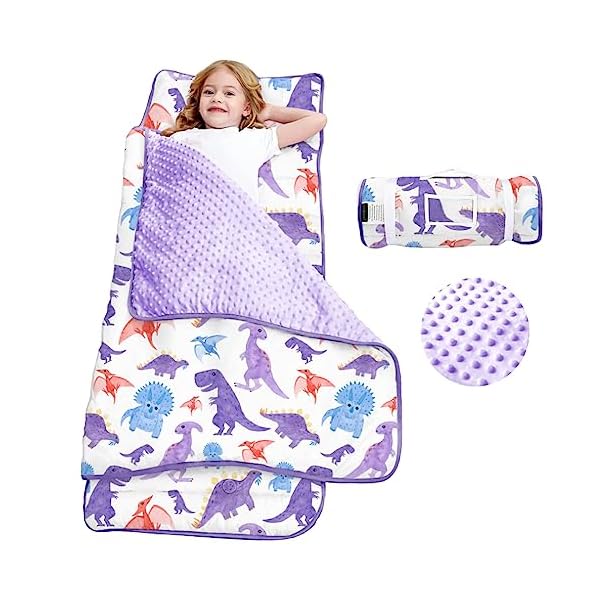 【Perfect Size for Toddlers】Nap mat measures 55.1″x22.8″x2″, comes with 22.8″x10″ pillow. Attached blanket measures 45″ x 35.5″. Suitable for children ages 3 to 6. Rolls up with Velcro closure tabs and easy carry handle.