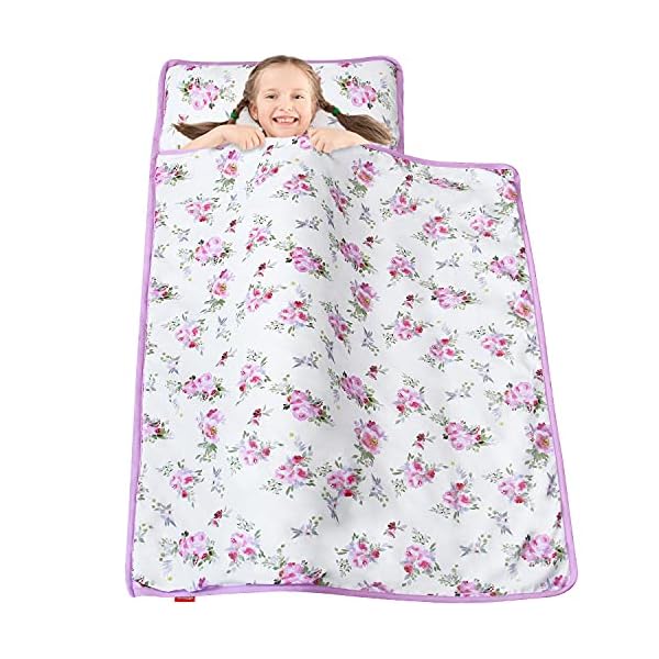Soft and Cozy: Moonsea toddler nap mat floral for girls use a super soft and warm fleece minky fabric and polyester materials. This high quality material is breathable, fade resistant. With the lovely floral pattern, that your children will love. The attached blanket is lined with fleece minky fabric to keep your little one extra warm. Including the pillow insert,the toddler nap mat will help your child get the rest they need with this designed specifically for them.