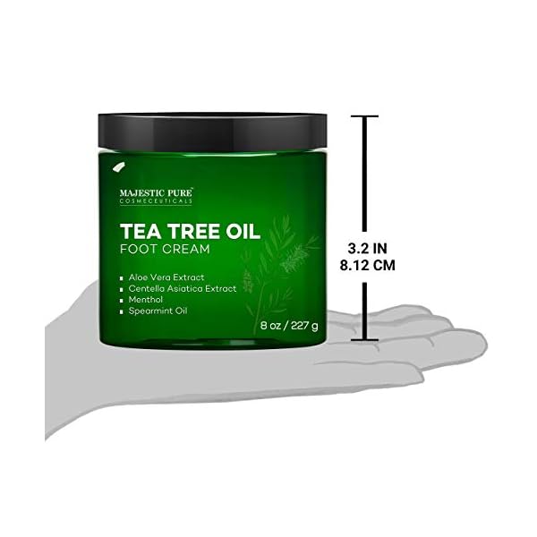 Majestic Pure Tea Tree Foot Cream is carefully crafted with skin nourishing ingredients such as 100% pure tea tree oil, aloe vera extract, and centella asiatica extract to purify skin for clean, soft, and moisturized feet. Powerful foot cream softens and conditions dry skin and calluses. Helps deodorize while fighting , leaving you with a fresh clean feeling. Click the button at the top of this page to buy with confidence. Safety Warning: Intended for external use only. Rub a very small amount on the inside of your elbow area to test for any allergic reaction before use. Avoid contact with eyes, keep out of the reach of children. Discontinue use if irritation occurs. If pregnant, consult with your health care provider before use. This product is not intended to diagnose, mitigate, treat, cure or prevent any disease.