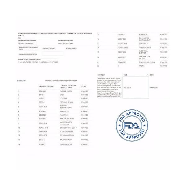 【Organic Ingredients】Water, Urea, Glycerin, Propylene Glycol, Isononyl Isononanoate, Mineral Oil, Allantoin, Hyaluronic Acid, Hydrogenated Polydecene, Salicylic Acid, Biosaccharide Gum-1, Sclerotium Gum, Cetearyl Alcohol, Trimethylglycine, Bisabolol, Dipotassium Glycyrrhizate, Ceramide 1, Oligopeptide-1, Aloe Vera Extract, Tea Tree Leaf Extract, Ethylhexylglycerin, Aroma, Hydrolyzed Jojoba Esters.