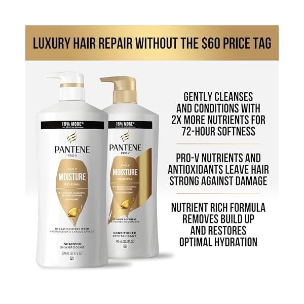 HARD WORKING, LONG LASTING Your haircare should work as hard as you do. Pantene Daily Moisture Dual Pack + Rescue Shot contain a shampoo and conditioner to cleanses and hydrate parched hair by removing dirt and impurities while moisturizing your locks for softness and manageability. Plus, a Miracle Rescue Intense Rescue Shot to help deeply repair signs of hair damage. These moisturizing hair products contain 2x more nutrients for 72+ hours of softness, so you can wash less and keep the cleansed and hydrated feel. This moisturizing shampoo and conditioner are safe for colored hair and crafted with protective anti-oxidants, strengthening lipids, and pH balancers that won’t weigh your hair down, leaving you with strong and healthy strands. With Pantene Pro-V Daily Moisture Renewal Shampoo and Conditioner + Rescue Shot, say goodbye to dry locks and unleash soft, hydrated hair that looks and feels beautiful for longer. 2X MORE NUTRIENTS, LASTS FOR 72+ HOURS.