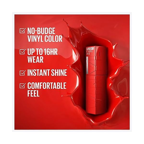 Shake up your longwear with Super Stay Vinyl Ink. This Liquid Lipcolor delivers no-budge saturated vinyl color and up to 16HR wear. Its color lock formula defies smudging and transfer. Swipe the formula across your lips and enjoy an instant shine and all day color. Available in 10 high-impact vinyl shades for your every lip look. From brights to saturated red tones and even the perfect everyday neutrals, express yourself with Maybelline longwear lipcolor
