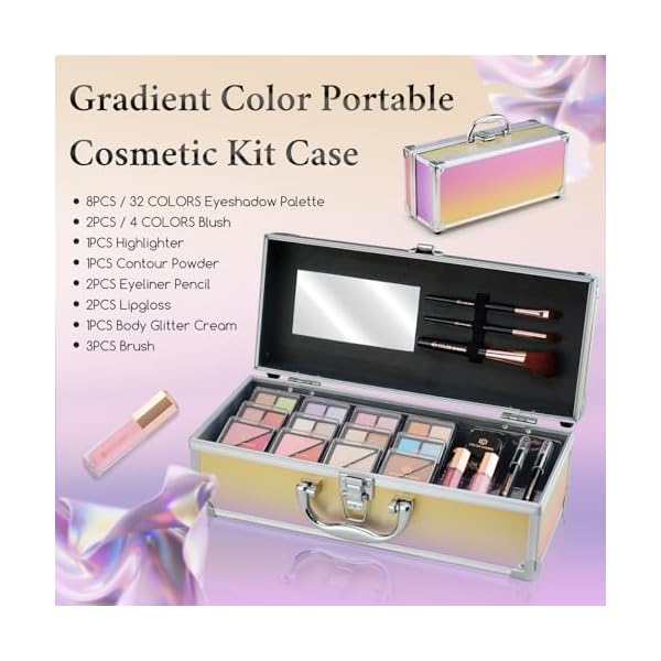 【Complete Makeup Collection】: Include 32 colors eyeshadow, 4 colors blush, 2 colors highlighter, 1 color bronzer, 1 color contour powder, 1 color glitter cream, 2 colors lipgloss, 2 pcs eyeliner pencils, 3 pcs makeup brushes, 1 pcs mirror.