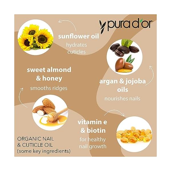 PURA D’OR USDA Certified Organic Biotin Cuticle & Nail Oil is the perfect solution for stronger healthier nails. They won’t break or crack. Specially formulated with a nourishing blend of Biotin, Sunflower Oil, Honey, Jojoba Oil, Almond Milk, and Vitamin E it strengthens nails and promotes healthier nail growth. Safe for acrylic and gel applications, this cuticle oil for nails helps ensure nailbeds stay hydrated and prevent cracks and flakes, for beautiful looking hands. Use daily to see the difference as nails grow longer and stronger with each use. Prevent dry skin and never deal with uncomfortable cracked cuticles again. Our Organic Biotin Cuticle & Nail Oil is gentle and free from harsh ingredients and cruelty-free. All PURA D’OR products are produced and bottled in our environmentally conscious Southern California facilities.