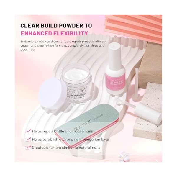 📍 Comprehensive Repair Solution – Aokitec build powder nail repair kit includes a powerful combination of 28g clear build powder, 15 ml gel glue resin specially formulated to swiftly repair damaged or cracked nails. Equipped with nail tools (nail file and nail buffer) for easy application. Say goodbye to nail woes with this quick nail repair solution.
