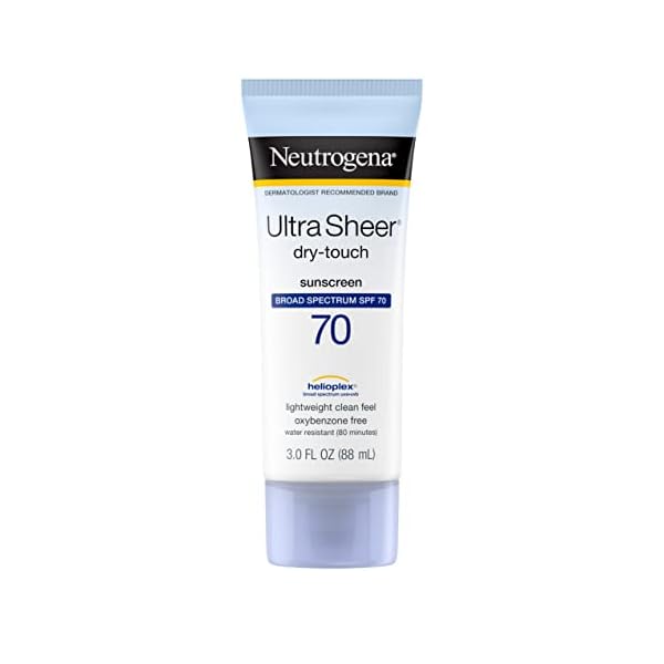 3-fluid ounce travel size bottle of Neutrogena Ultra Sheer Dry-Touch Non-Greasy Sunscreen with SPF 70 for broad spectrum UVA/UVB protection