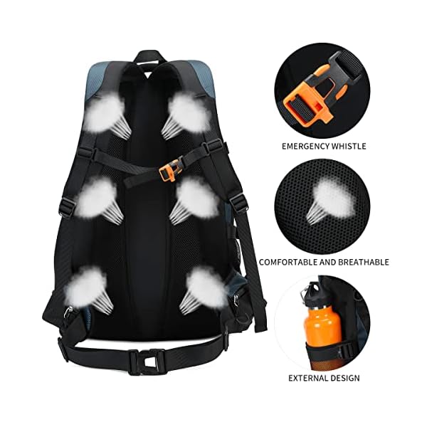 Breathable Mesh Padding and Whistle – For passionate hikers or trekkers, this traveling backpack equips with the ventilated mesh padding shoulder straps and backside, breathable system and lightweight design are the perfect hiking backpack for outdoor sports. Ergonomically designed provides body comfort even when pack is completely full. Keep it cool even in summer.