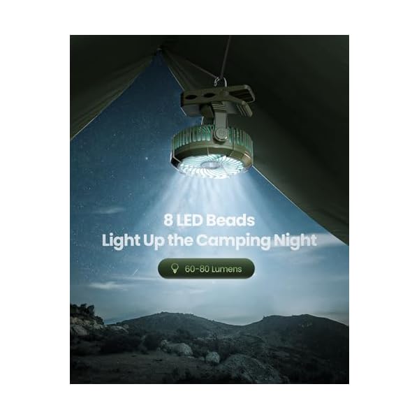 3 Adjustable Speed and Led Lights: The personal fan comes with 3 gear speed, one button to adjustment of wind speed and turn on or off lights. Maximum wind speed of 5M/S, be cool quickly. Table fan composed of 8 LED beads provides an ideal light source for night activities, a camping essentials for picnics, barbecue, fishing at night