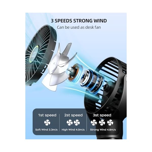 【360° ROTATION】Enjoy a 360° rotation capability, providing a full range of airflow in every direction. The three-legged design allows it to function as a baby stroller fan, desktop fan, or handheld fan, catering to your personal needs. Keywords include personal fan and small desk fan battery operated.