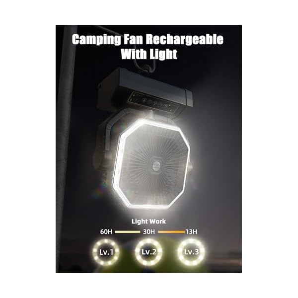 PORTABLE CAMPING FAN WITH Light & Hook: This camping fan battery powered offers 12 LED beads, 3 dimmable brightness functions for different occasions. Great portable fan for bedroom, Office, Camping, RV, Power Outage, Rtc. The 2-in-1 powered fan for camping has a 360° rotating hidden hook so you can hang the fan up and adjust the right angle. In addition, it is also suitable for use indoors as a large battery operated fan. This would be a great gift for your family and friends.