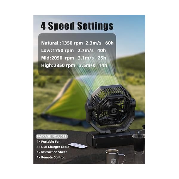 20000MAH BATTERY POWERED FAN: This portable fan battery operated is equipped with a 20000mAh rechargeable battery with a working time of 15h-25h-40h-60h and four adjustable speeds, Allowing you to stay cool for a long time, In addition, The fan battery operated is equipped with Type-C input/output and USB output port, Which is convenient for charging the cordless fan, Making it a great choice for camping trips, Power outages, Hurricanes, Etc.