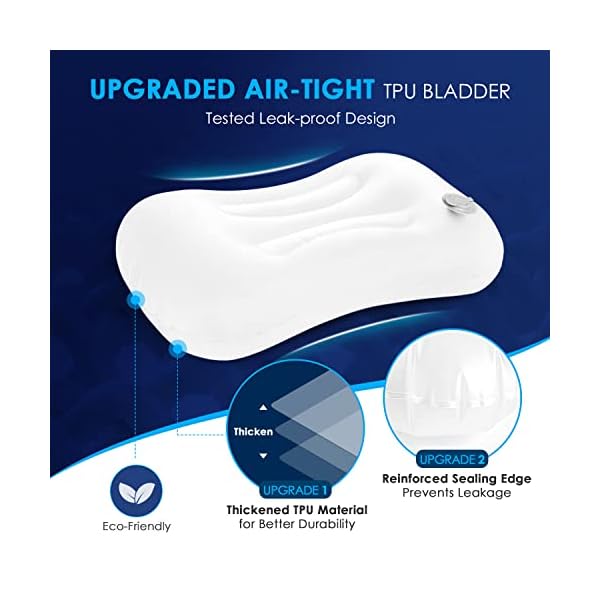 😊 𝗨𝗣𝗚𝗥𝗔𝗗𝗘 𝗙𝗢𝗥 𝗬𝗢𝗨𝗥 𝗠𝗔𝗫𝗜𝗠𝗜𝗭𝗘𝗗 𝗖𝗢𝗠𝗙𝗢𝗥𝗧 – Our blow-up pillow ensures your ultimate comfort. For either back or side sleeping, you are offered sufficient neck support thanks to the enhanced pillow height and unique ergonomic design that perfectly fits your neck. Pillow firmness through valve adjustable to fit your preferences. Our ergonomic pillow also serves as a lumbar pillow and helps alleviate back pain due to long travel or work time.