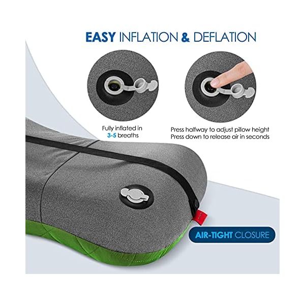 ✨ 𝗗𝗘𝗧𝗔𝗜𝗟𝗦 𝗗𝗘𝗦𝗜𝗚𝗡𝗘𝗗 𝗙𝗢𝗥 𝗬𝗢𝗨𝗥 𝗖𝗢𝗡𝗩𝗘𝗡𝗜𝗘𝗡𝗖𝗘 – With unique ONE-CLICK VALVE, our travel pillow is fully inflated in only a few breaths. Simply click the button and the valve lets air in, without losing air when you take another breath. Click the button again and the hiking pillow deflates just in seconds. Enjoy your sound sleep through night thanks to the DETACHABLE ELASTIC STRAP on the back of pillow which keeps your backpacking pillow in place on e.g. sleeping pads.