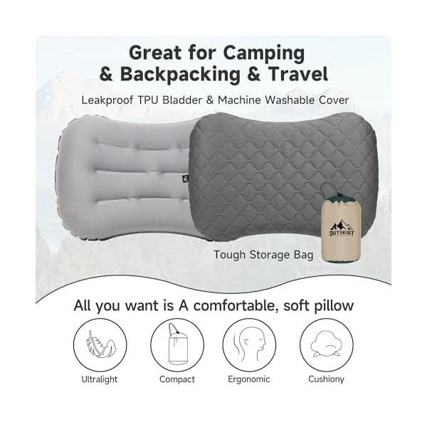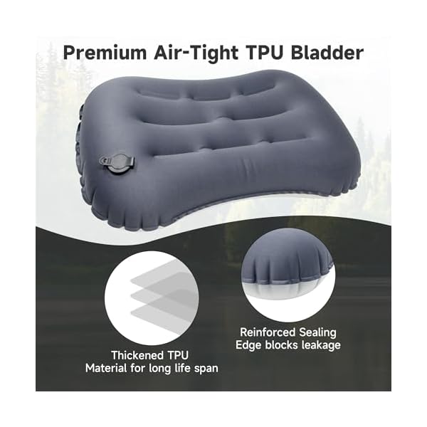 【EXCELLENT DURABILITY & NON-SLIP DESIGN】 No more air leaks from this inflatable camping pillow. Comes with a separate bladder made from thickened TPU material which prevents air leaks effectively. The extra removable elastic strap will prevent the inflatable air pillow for camping from moving around while sleeping.