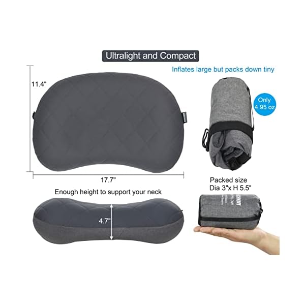 Ultralight and Compact: This inflatable backpacking pillow weighs only 4.95 ounces. The size is adequately large to well support your head and neck when inflated, while packs down into included soda can sized storage bag when deflated, easy to put in your backpack or even in pocket, perfect for camper, hiker, backpacker and traveler.
