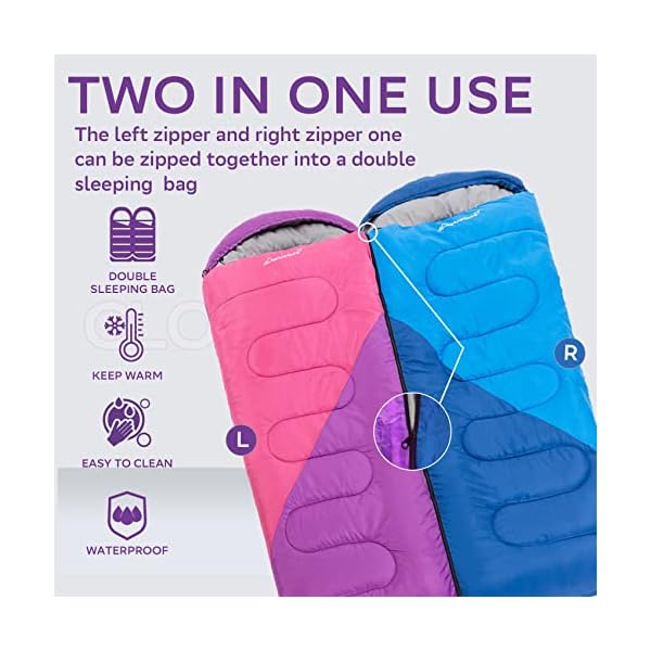 FEATURES YOU SHOULD KNOW: 1. Updated extra patch design applied to the kid’s sleeping bag prevents annoying zipper snags. 2. Mummy hood with strap offers extra warmth to your head and cocoon your self in, the drawstring cord adjusts tightness as you wish. 3. Velcro secure for the zipper prevents unexpected unzipping during the night. 4. Separated zippers make this adult sleeping bag great for both cold and warm weather!
