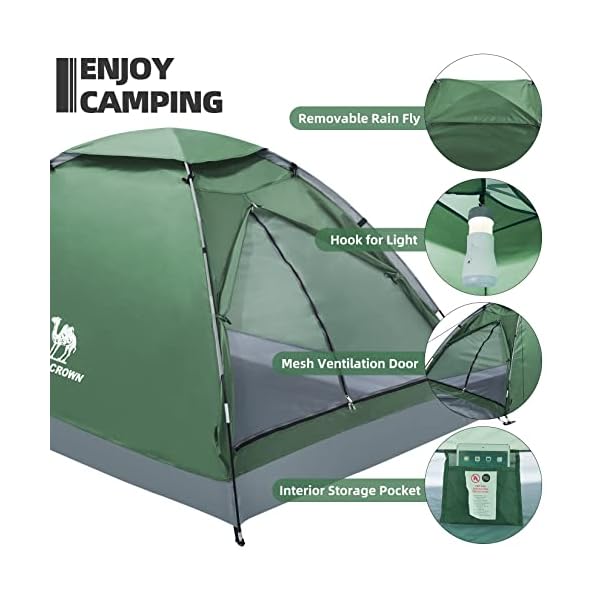 【Durable & Stable】CAMEL CROWN camping tent is divided into two layers, the inner and outer tents are superimposed together to form a windproof and rainproof tent. High grade fiberglass poles for nice wind resistance. Space can accommodate 2 person, suitable for friends or family travel hiking camping.