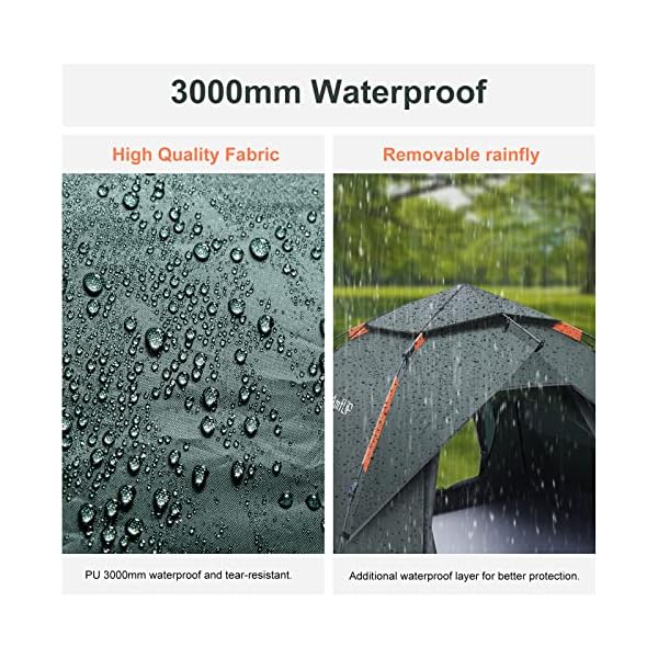 Durable & Waterproof & Insect Resistant – The strong fiberglass poles are designed with a windproof structure and a ventilated, rainproof and detachable outer tent canvas can ensure the tent remains stable in any weather. The outer tent canvas made of 210T fire retardant polyester (water resistance index up to 3,000mm), two-layer construction, a durable groundsheet that keeps the interior dry and insect-free during the night.