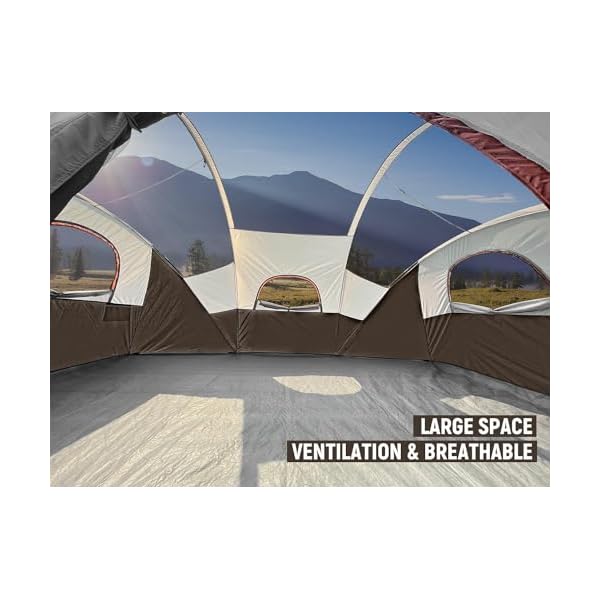 【LARGE SPACE VENTILATION & BREATHABLE】 To enhanced airflow, this camping tent has 1 large mesh door, 4 mesh windows & breathable top ceiling, which enables fresh air and a warm breeze to come in and out easily. Meanwhile, you could also enjoy the starry sky at night with your family members while lying in the tent.