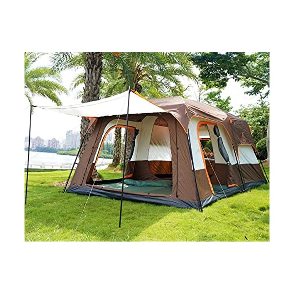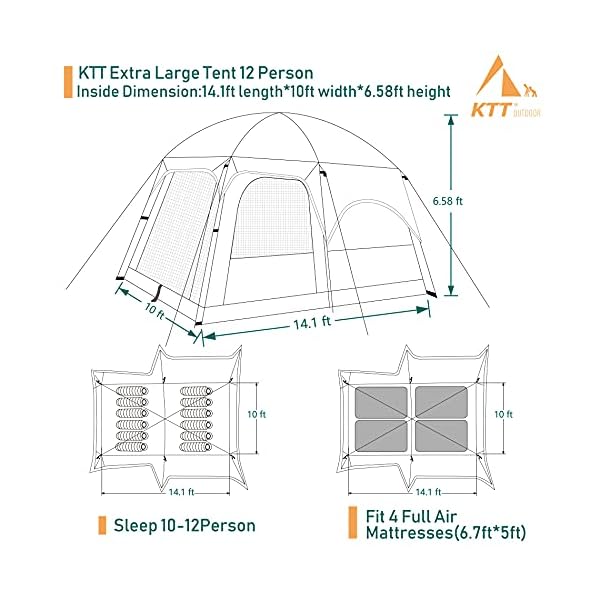 Large space:Inside dimension14.1ft length*10ft width*6.58ft height, fit 4 full air mattresses(6.7ft*5ft/200cm*150cm),can accommodate 10~12 person,3 doors with mesh,3 Windows with mesh,divided into two rooms by separation curtain.