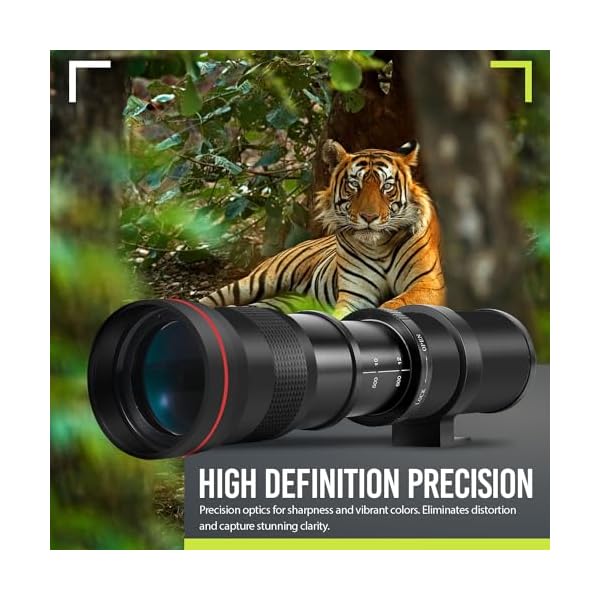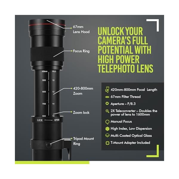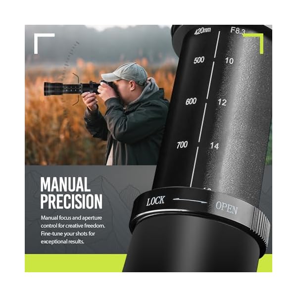 Precision at its Best – With its 420mm-800mm focal length and 62mm filter thread, capture intricately detailed photos. The sophisticated f/8.3 aperture ensures photos are crisp and clear, highlighting your subject matter beautifully