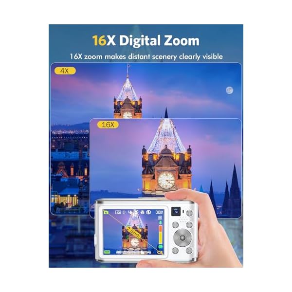 📸[48 MP & FHD 4K DIGITAL CAMERA]- YOODEE digital camera support premium 48MP photos and 4K HD video recording.Advanced CMOS technology ensures precise detail,capture vivid moments for preserving your memorable experiences.The 16x digital zoom point and shoot camera with 32GB TF card is ideal for beginners to capture distant scenery.