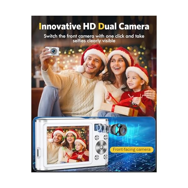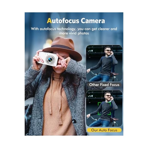 📸[AUTOFOCUS DUAL-CAMERA]- Innovative dual-camera design! Switch to the front camera for easy selfies with just one click, and utilize the rear camera for creative video, easily unlocking various shooting skills.The compact digital camera supports a powerful focusing function to ensure precise focus of the front and rear lenses, allowing you to easily capture clear and wonderful moments. Our 4k autofocus digital camera perfect as a Christmas or birthday gift!