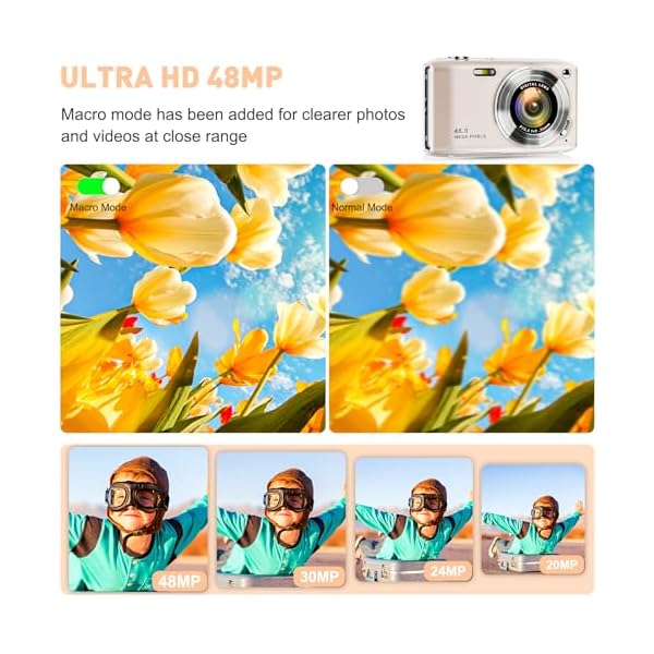 📸Digital Camera 48MP: This digital point and shoot camera adopts advanced CMOS sensor, allow for capturing 4K videos and 48MP photos without complex settings, record daily highlights. Features macro mode and 2.88-inch IPS color screen, enable clear shooting of flowers, plants, or small insects, and more at 4 inch-5 inch, suitable for beginners and children. Note: when adjusted to macro mode, there is a flower icon on the screen.