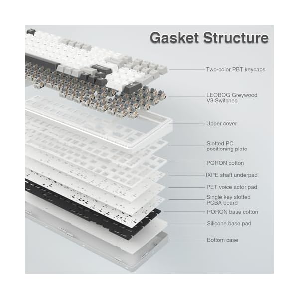 【Gasket Structure & PCB Single Key Slotting】This computer keyboard features a gasket structure, extended integrated silicone pad, and PCB single key slotting, better optimizes resilience and stability, making the hand feel softer and more elastic. Five layers of filling silencer fills the gap between the PCB, the positioning plate and the shaft,effectively counteracting the cavity noise sound of the shaft hitting the positioning plate, and providing a solid feel.