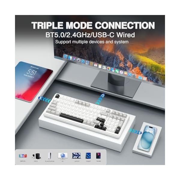 【Multi-Device Connection】AULA F98 wireless mechanical keyboard provides three connection methods, including Bluetooth 5.0, 2.4GHz wireless mode, and USB wired mode. It can be connected to up to five devices at the same time, and switch between them easily by FN+ combination keys. No limits about your keyboard connection to meet the needs of work, gaming, and study.
