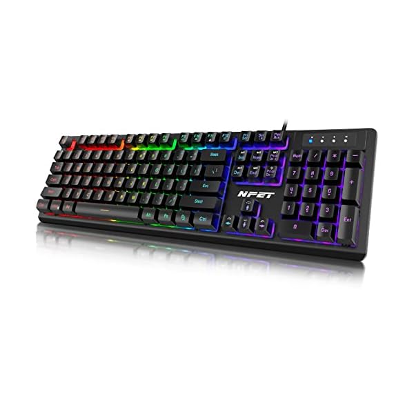 NPET K10 Wired Gaming Keyboard, LED Backlit, Spill-Resistant Design, Multimedia Keys, Quiet Silent USB Membrane Keyboard for Desktop, Computer, PC (Black)