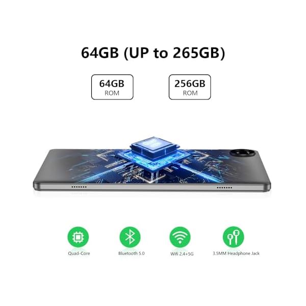 【More Functional Tablet】Android Tablet with Front 2.0 Mega pixel, Back 5.0 Mega pixel camera with Flash Light, Support Bluetooth, Built-in GPS, 6GB(2+4) 64GB Storage (Most 256GB Expand, card not included), 1080P Videos. Meets Reading, Photograph, videos, Music, etc. Suitable for Most Life Scenarios.