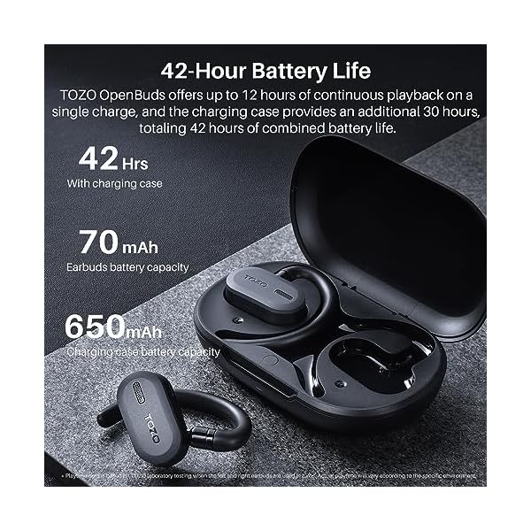 【Dual Connectivity & 42 Hours Playtime】The TOZO Open Buds feature powerful dual connectivity, allowing you to connect two phones simultaneously for seamless switching. The slim charging case is convenient to carry with you, and the headphones have a total battery life of up to 42 hours, ensuring uninterrupted listening for extended periods.