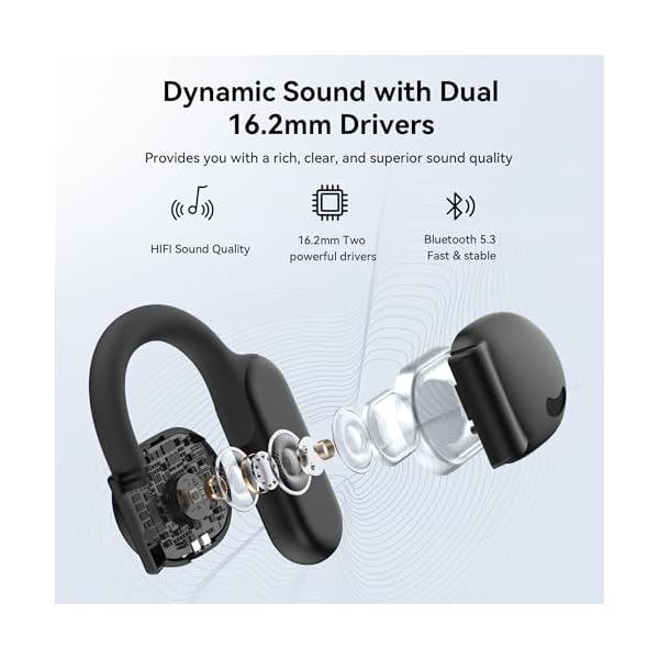 【ENC Noise Reduction & High-Quality Sound】Aubor Open-Ear Wireless Bluetooth Headphone features built-in dual microphones and ENC noise cancellation technology that monitors surrounding sounds and filters out ambient noise for clear, hands-free calls. Featuring top-of-the-line bio-diaphragm technology and 16.2mm dynamic drivers, these open-ear Bluetooth headphones deliver a rich and consistent listening experience at any volume, immersing the listener in a fully immersive audio environment.