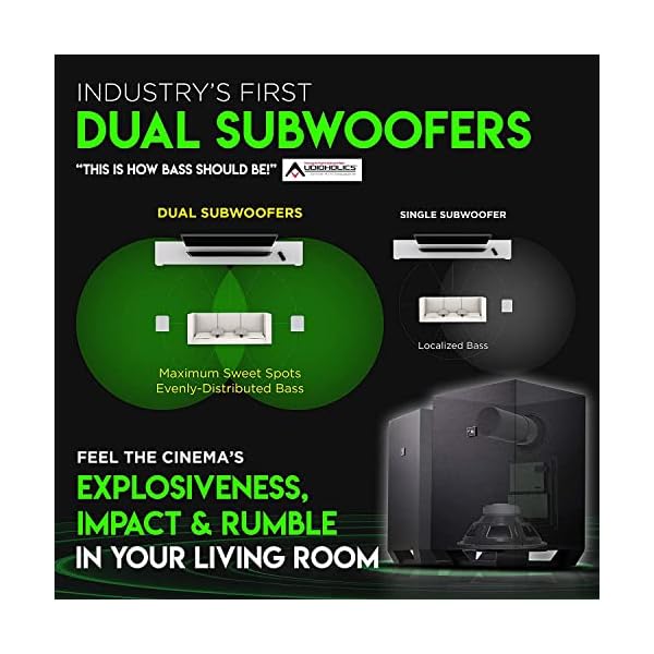 TWO 2-WAY REAR SPEAKERS (industry’s 1st!) produce spacious and dynamic surround sound. Each of them (connected to sub via RCA wires) is constructed with a tweeter that reproduces high frequencies with captivating clarity, and a full-range driver that delivers surround effects with power and precision. Simply put, the surround sound performance from simulated/virtual 2.1 or other 5.1 channel surround soundbars does not come anywhere close to this.