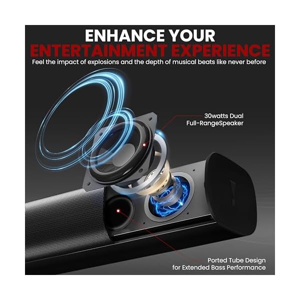 Features: LED Display, Designed to Sit Under Your Television, Home Theater Tabletop TV Stand Mount, Powerful and Compact Speaker Sound Bar System, Built-in for Instant Music Streaming, Works with All of Your Favorite Devices, (iPhone, Smartphone, iPod, MP3 Player, iPad, Tablet, PC, etc.), System Doubles as TV Speaker Base Entertainment System, Ported Tube Design for Extended Bass Performance, Full-Range Audio Spectrum Stereo Sound Reproduction, Convenient Source Selection with LED Indicators, Easy Touch Button Audio Select Control Center, Aux (3.5mm) Input Connector Jack, Easy-to-Use and Easy-to-Setup, What’s in the Box:, TV Soundbar, Audio Connection Cables, Remote Control, Power Adapter, Technical Specs: 2.0 Channel Soundbar, RMS Power Output: 30 Watt (15 x 2), Speaker Impedance: 4 Ohm, Inputs: 3.5mm (AUX), OPTICAL Input, USB Port, HDMI/ARC, Power Supply: AC100-240V~50/60Hz, DC15V/2A, Frequency Response: 60Hz – 20kHz (+/- 6dB), Input Sensitivity: 450mV, S/N: 63dB, THD: 1%, Remote Control include 3V Lithium Battery CR2025, Soundbar Unit Size: 15.75 ” x 2.56” x 3.94” -inches
