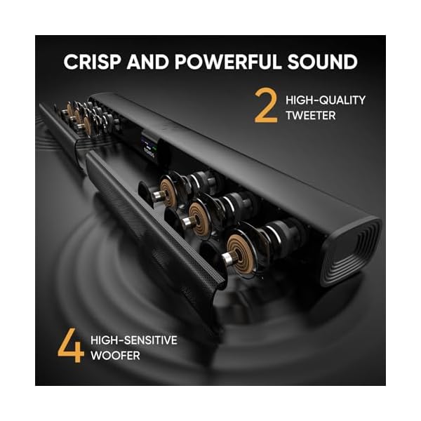 Crisp Treble and Punch Bass: The RIOWOIS soundbar is equipped with four high-sensitivity woofers and dual 2-inch tweeters, providing a remarkable audio experience. With the help of the four high-sensitivity woofers, the soundbar effortlessly delivers deep bass while maintaining clear vocals. Moreover, the inclusion of two tweeters expands the soundstage, creating a surround sound effect that immerses you in the audio from all directions.